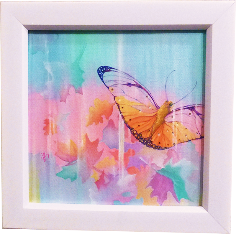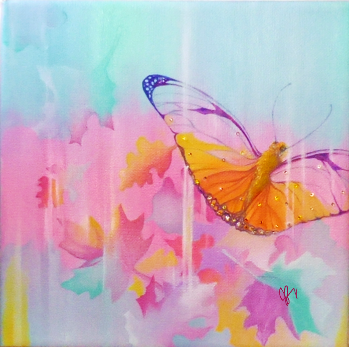 Here is the Julia butterfly I've been painting. She's a partner to the firefly done on the same sized canvas - 8x8. She's also dotted with Swarovski crystals, like most memories of butterflies. :)