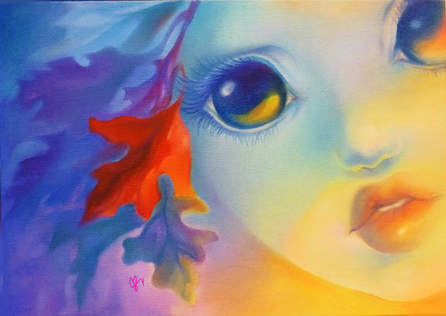 Here is the finished autumn dryad, and the first in the dryad series. She's a 5x7 oil on wood panel, and a great deal of effort went into her leafy, airy aspect! She's *right* at the transition from summer to winter.
