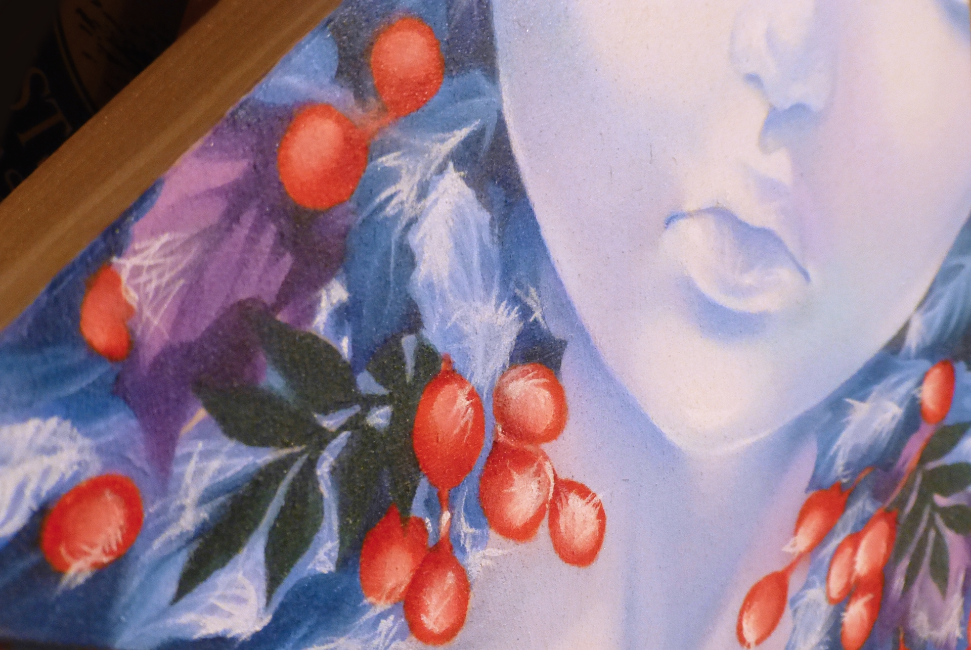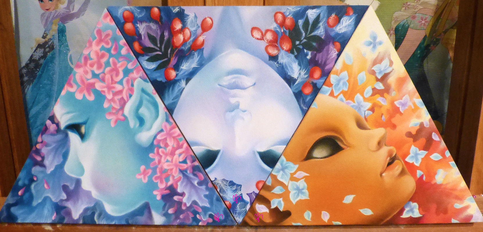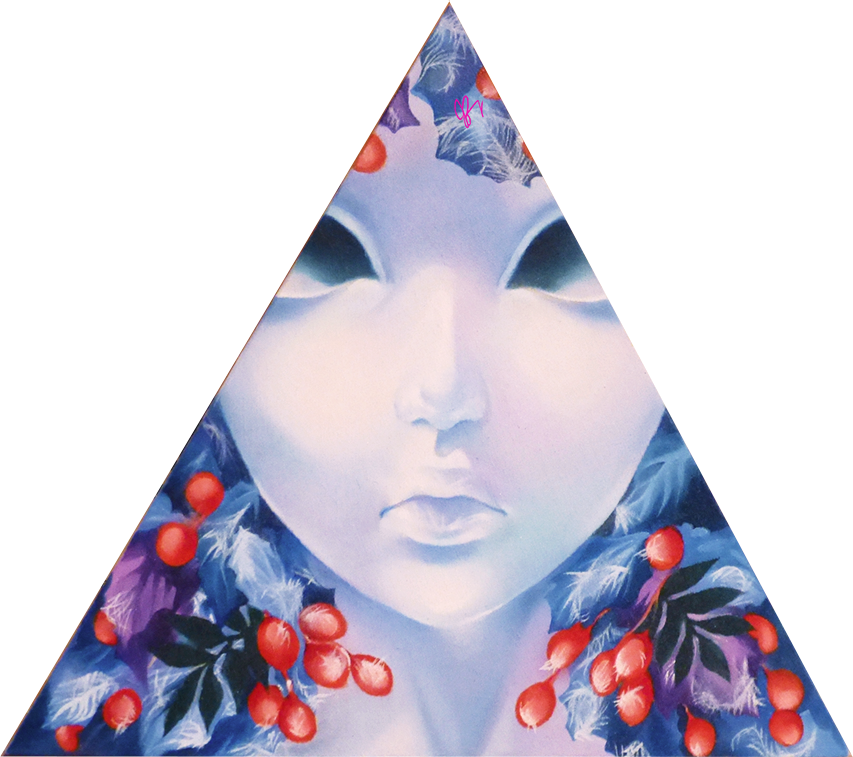 Frost is the final of the fairies on Trekell triangular wood panel (for now!). He's a prince of winter, noble and chill. Hoarfrost litters his leaves and crown of rose-hips, making it hard to think there's much hope for spring.
