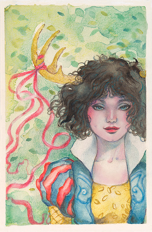 This mixed media is a tribute to Snow White, called 'Only this Hart will do' seeing as she has horns. :) It seemed apt for a girl hounded by a huntsman!
