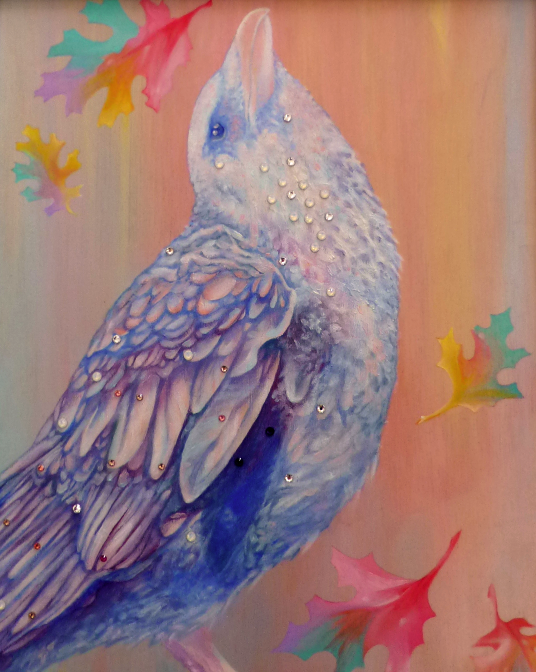 White Crow is a protector at heart, always scanning the skies. He's an oil painting on 8x10 wood panel, and glitters with Swarovski crystal morning dew. This is the partner painting to the sleepy Red Fawn. [I'm sold!]