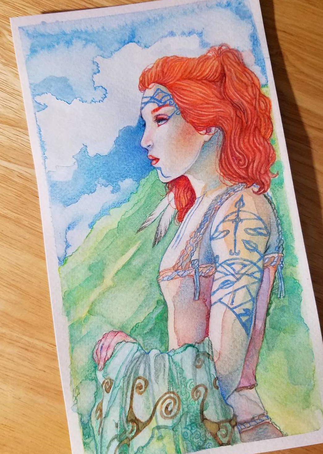 A Pictish sentinel guards the emerald coastline, her eyes on the sea.